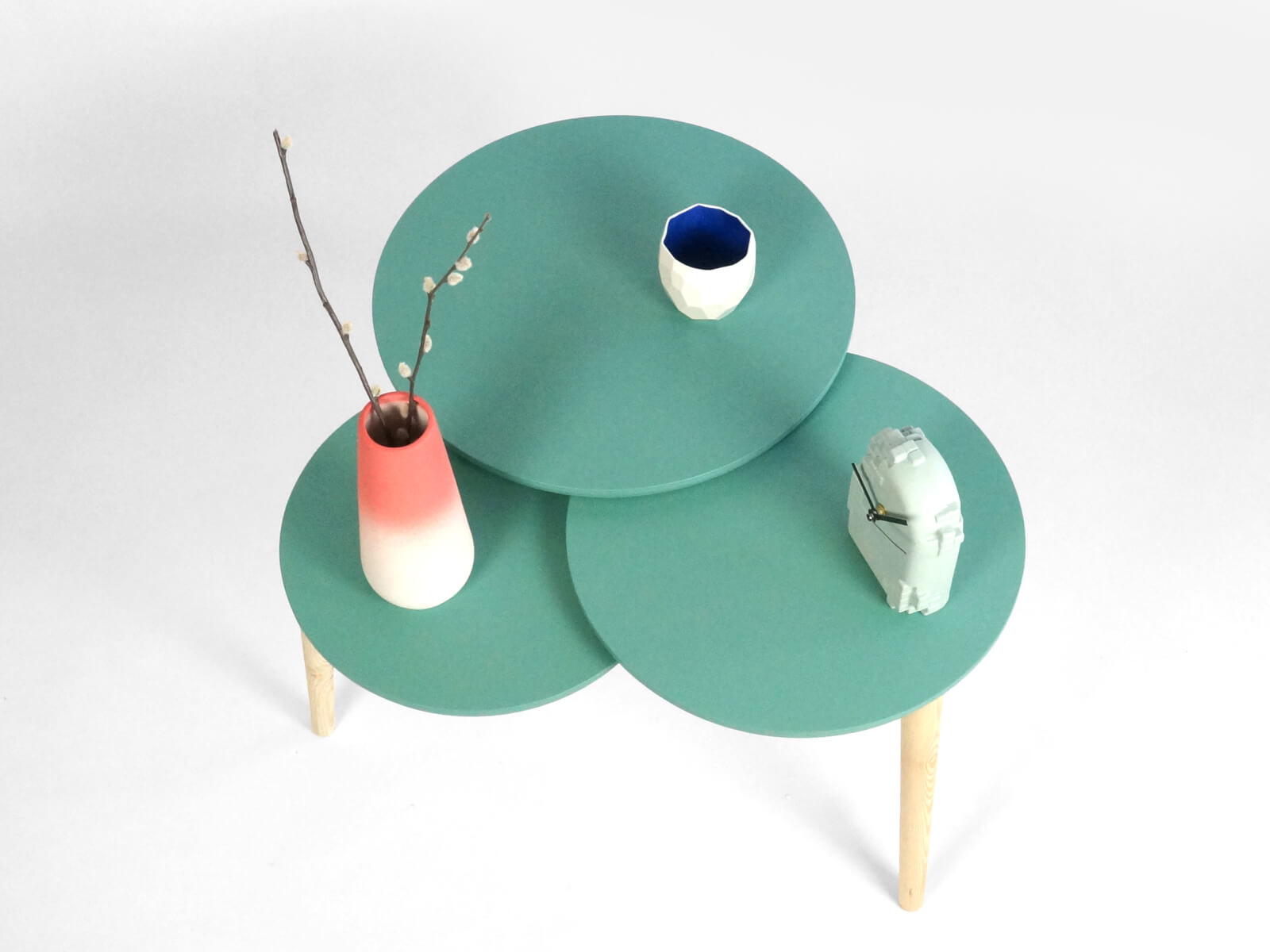 A compact side table, which can slide out almost triple the surface. Therefore great for any situation where more space is needed, or when you simply want to rearrange the shape. The three wooden tabletops are connected by a slider mechanism, as a result to allow the three parts to be moved in many configurations.